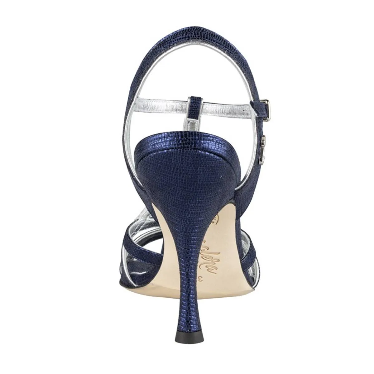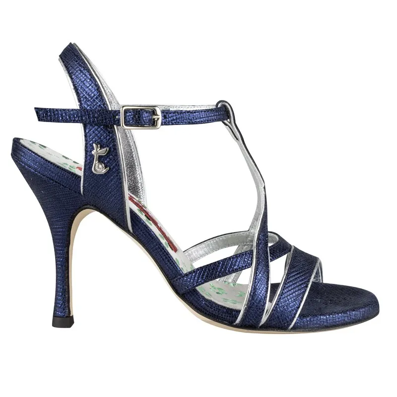 – Chaussures de tango en cuir imprimé bleu et bordures cuir argent