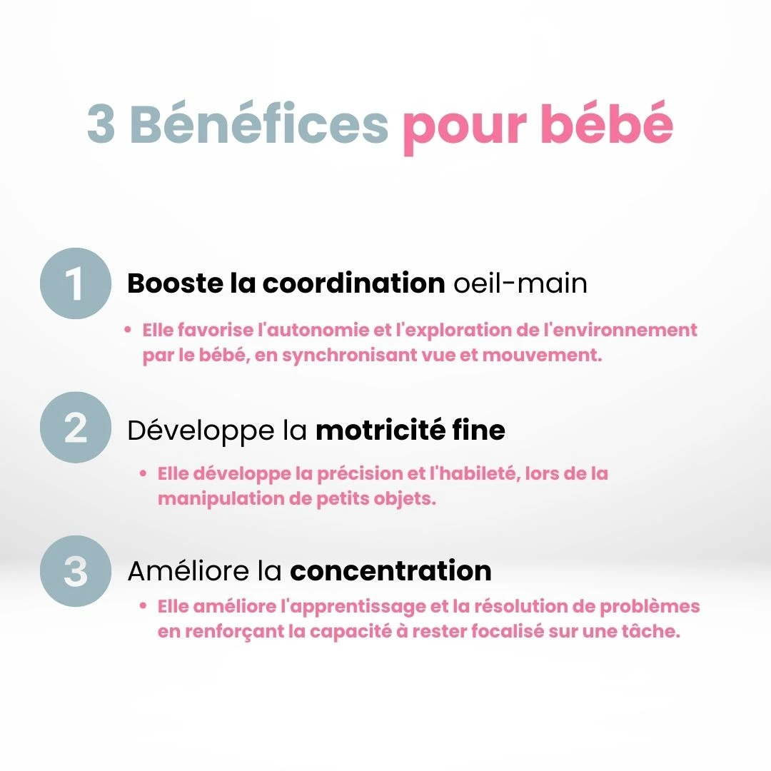 • Sa facilité d’utilisation et ses couleurs vives captent l’attention de l’enfant, l’encourageant à interagir et à développer sa coordination visuelle et tactile.